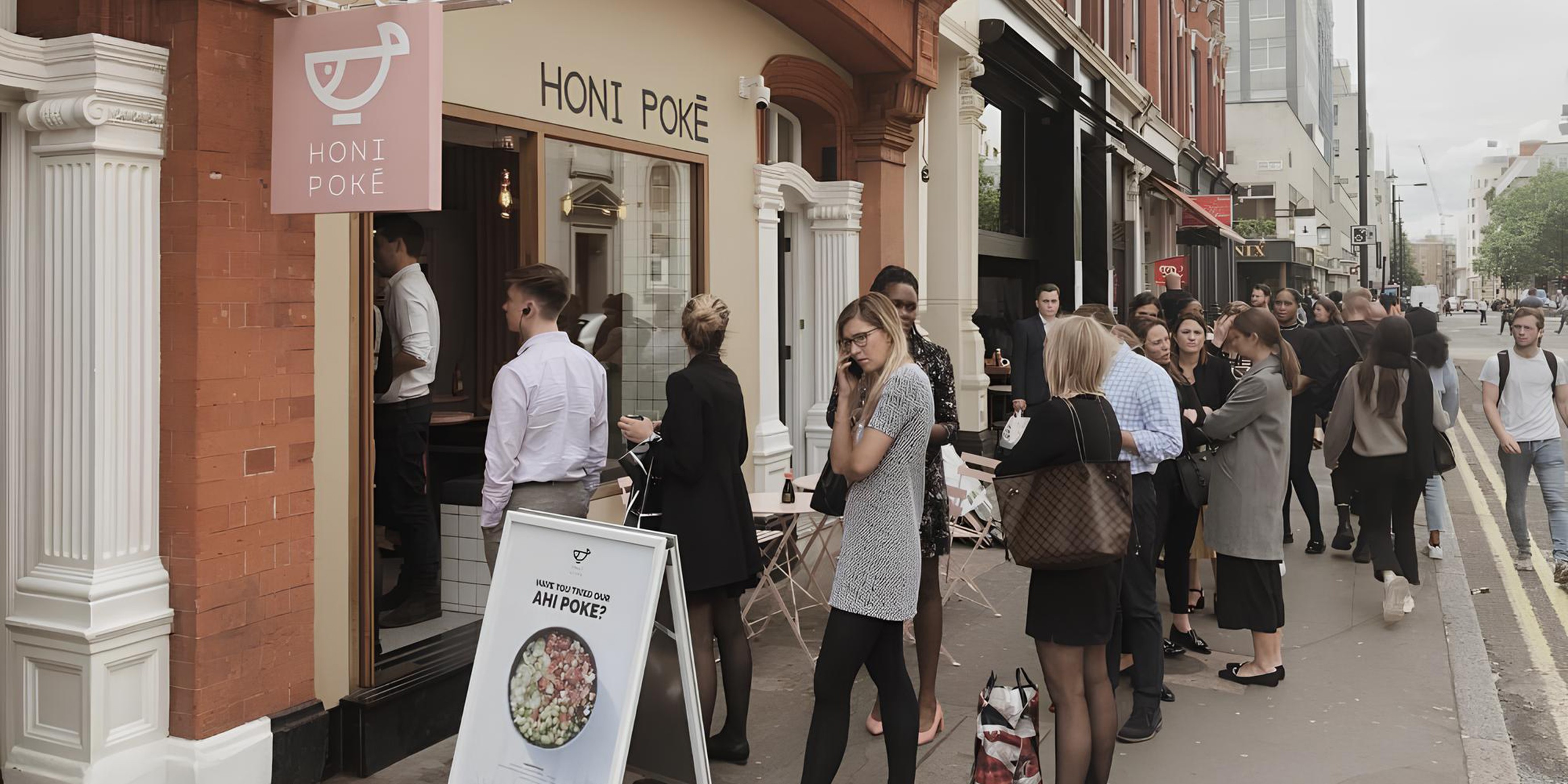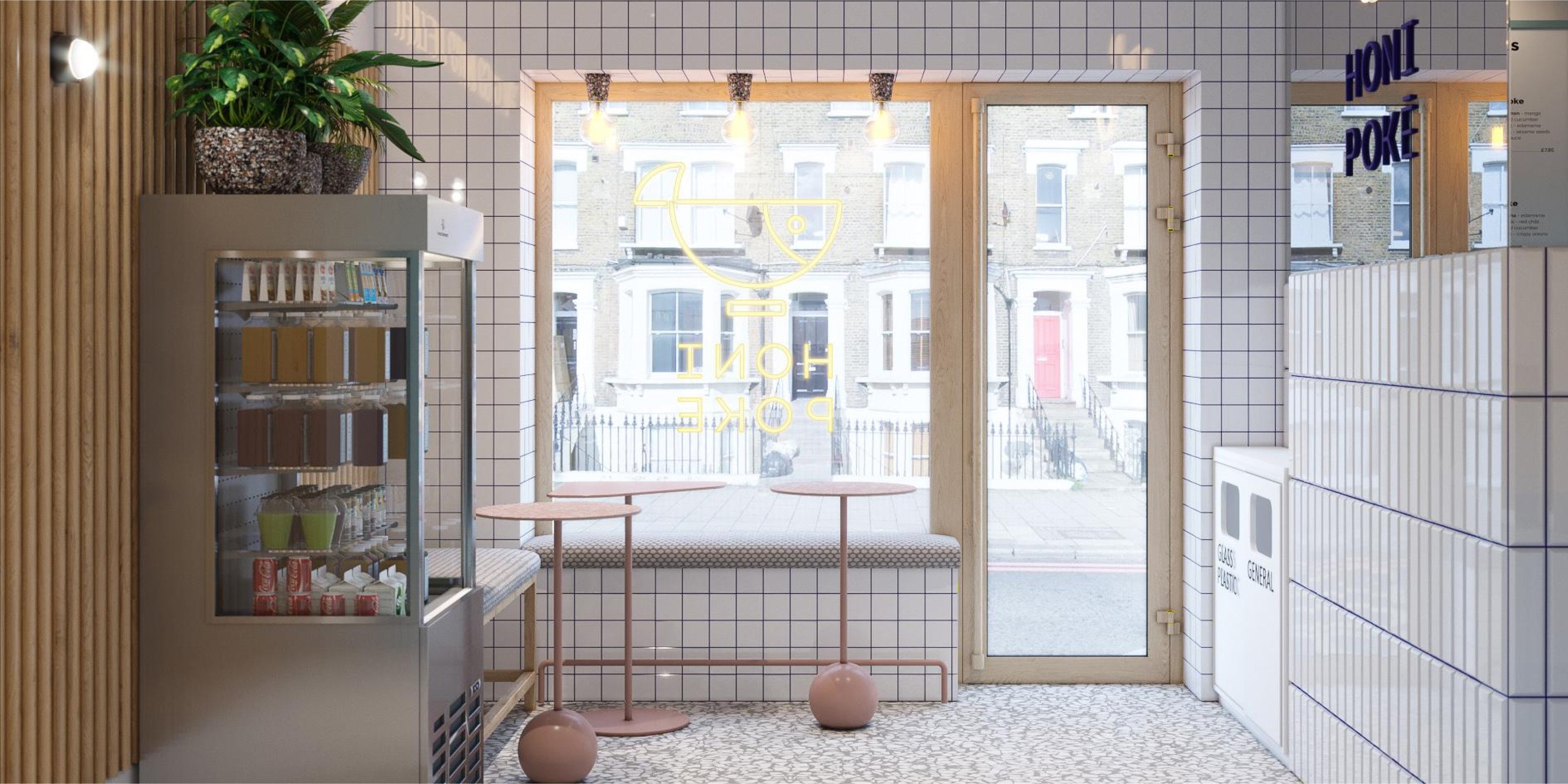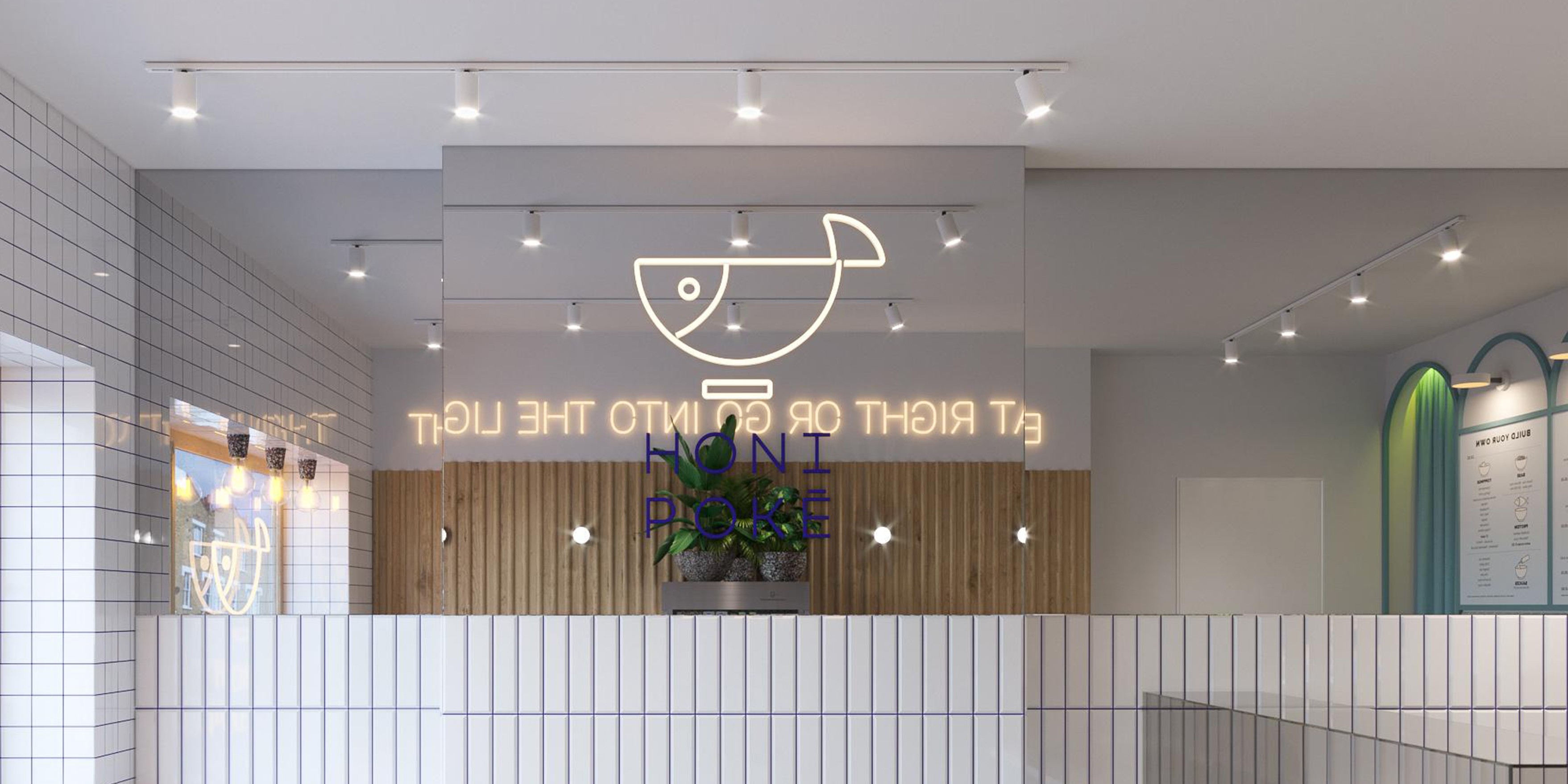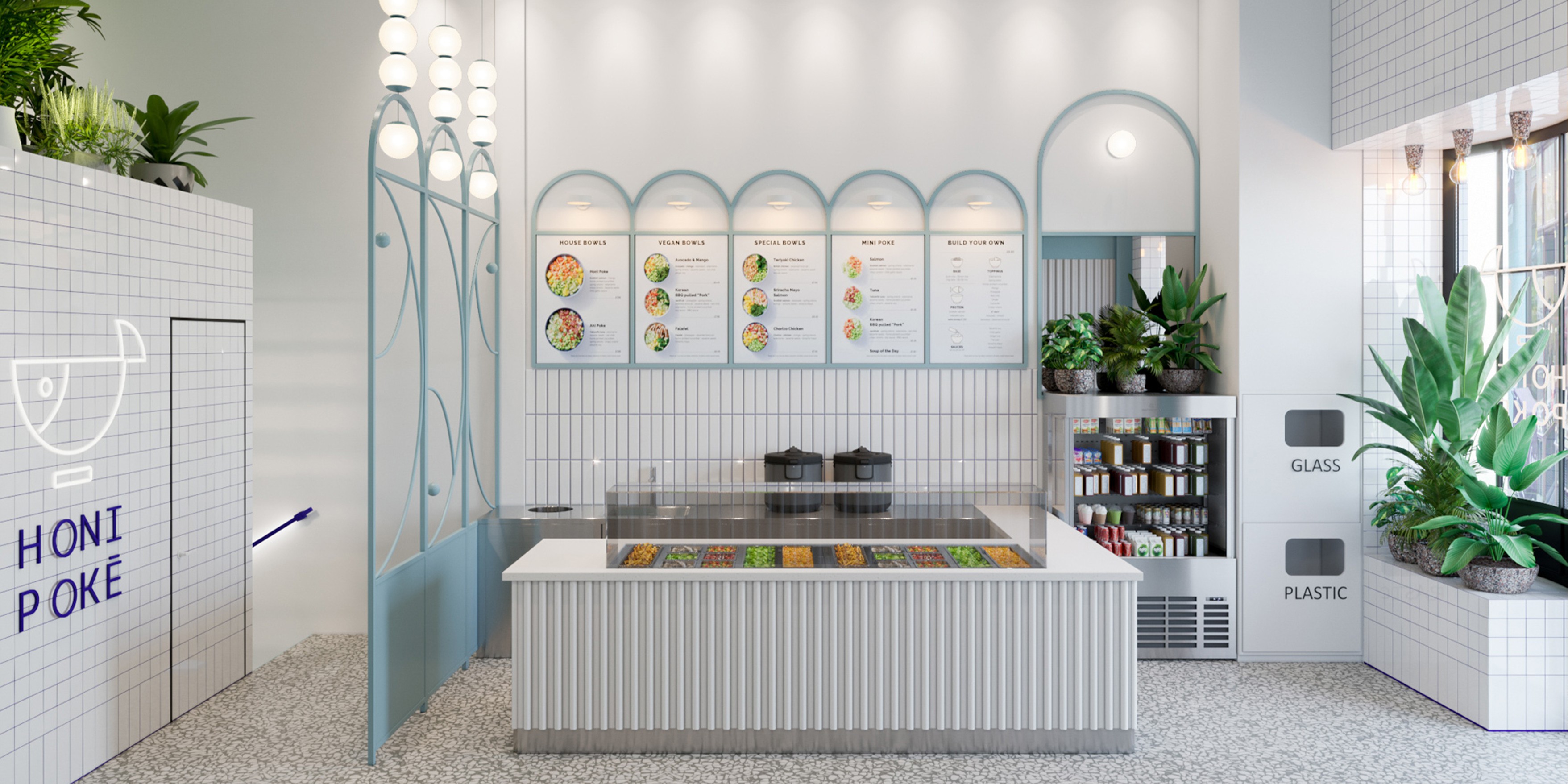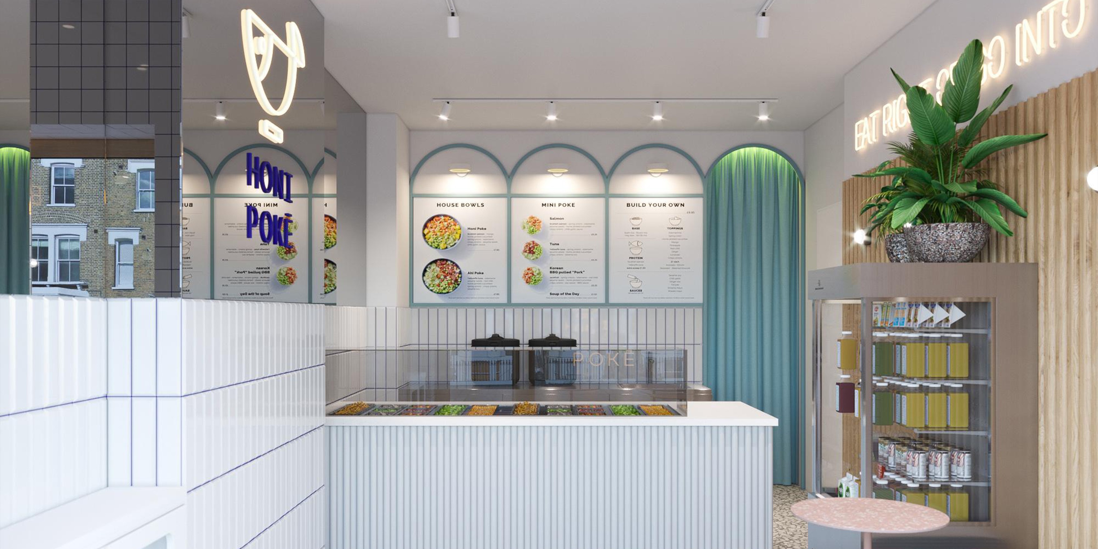 Honi Poke is a London fast-food chain that brings Hawaiian tradition into a healthy, modern dining experience. Its locations on Chancery Lane, Margaret Street and Upper Street are connected by a shared concept celebrating poke, a traditional dish made with fresh raw fish. The name Honi reflects a warm Hawaiian greeting that symbolizes friendliness, the core emotion of the brand. Pastel blues, bright white tones, greenery, and fluted textures create an atmosphere of clarity and warmth, inspired by fish markets and ocean waves.